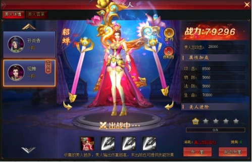 点击主界面的【进阶】按钮,该界面中可以对美人进行升阶和自动升阶操作,点击一键升阶后系统会一直升阶直到成功升阶或用完升阶道具。